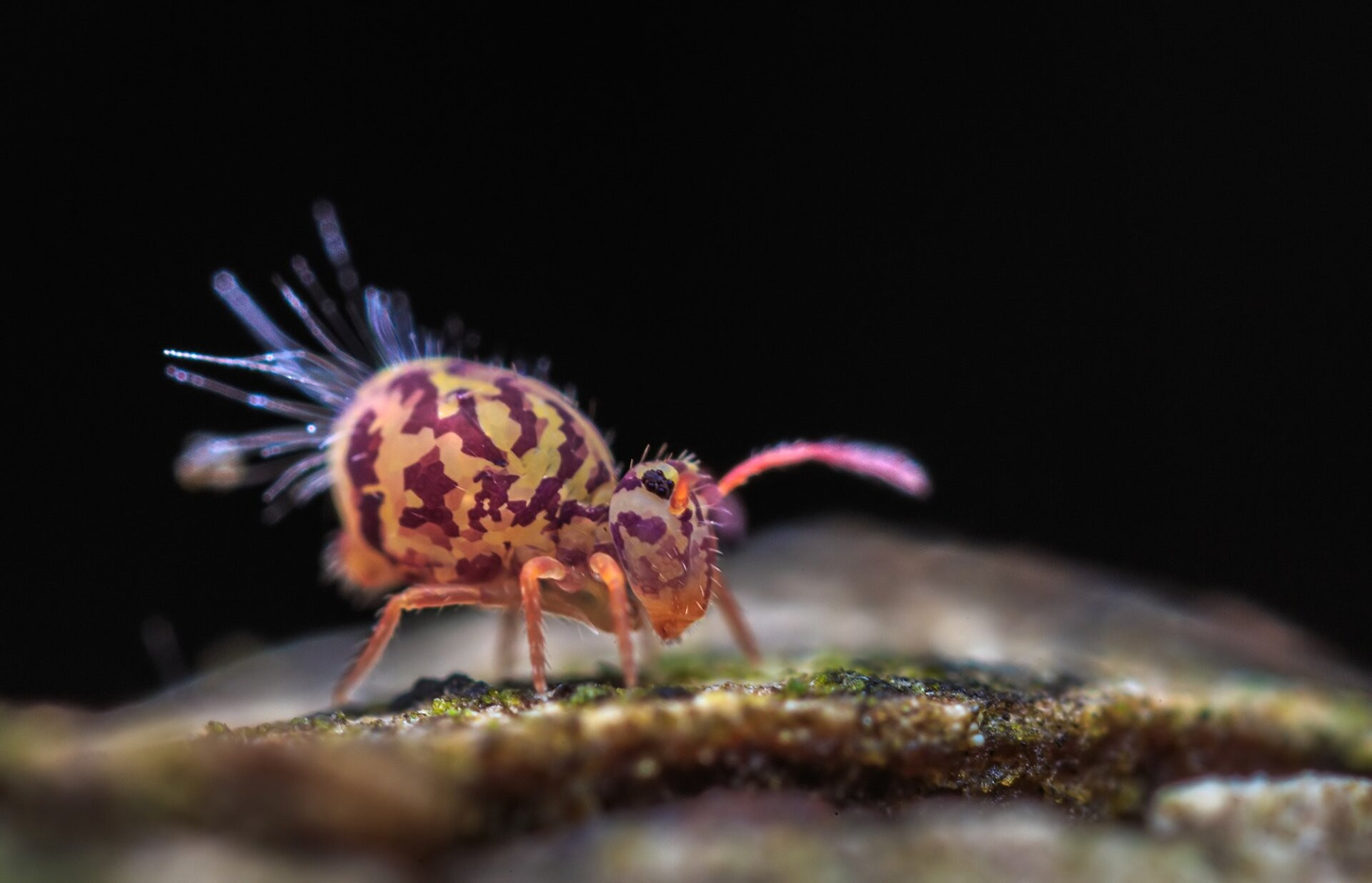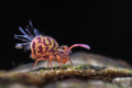 Az ugróvillás mellett az előtérben pici csillogó golyócskák is látszódnak, amelyek páncélosatkák