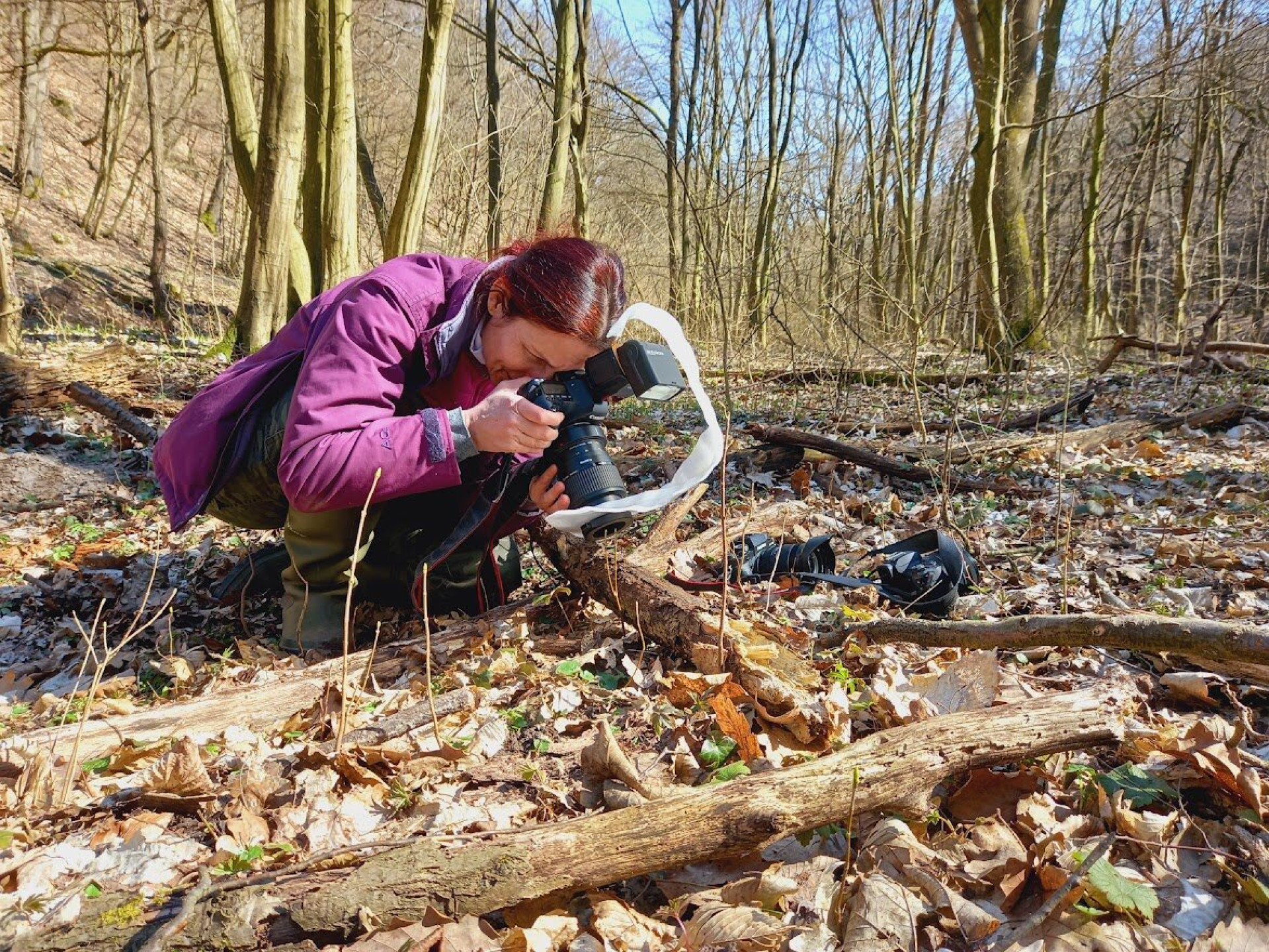 Zsolt kezében könnyűnek tűnt ez a kézből kifotózott módszer, de mivel mi még azzal is küszködtünk először, hogy a témát megtaláljuk, ezért hamar lekerült a földre a fa, és inkább lehasaltunk a fotózáshoz. De azért persze megpróbáltuk