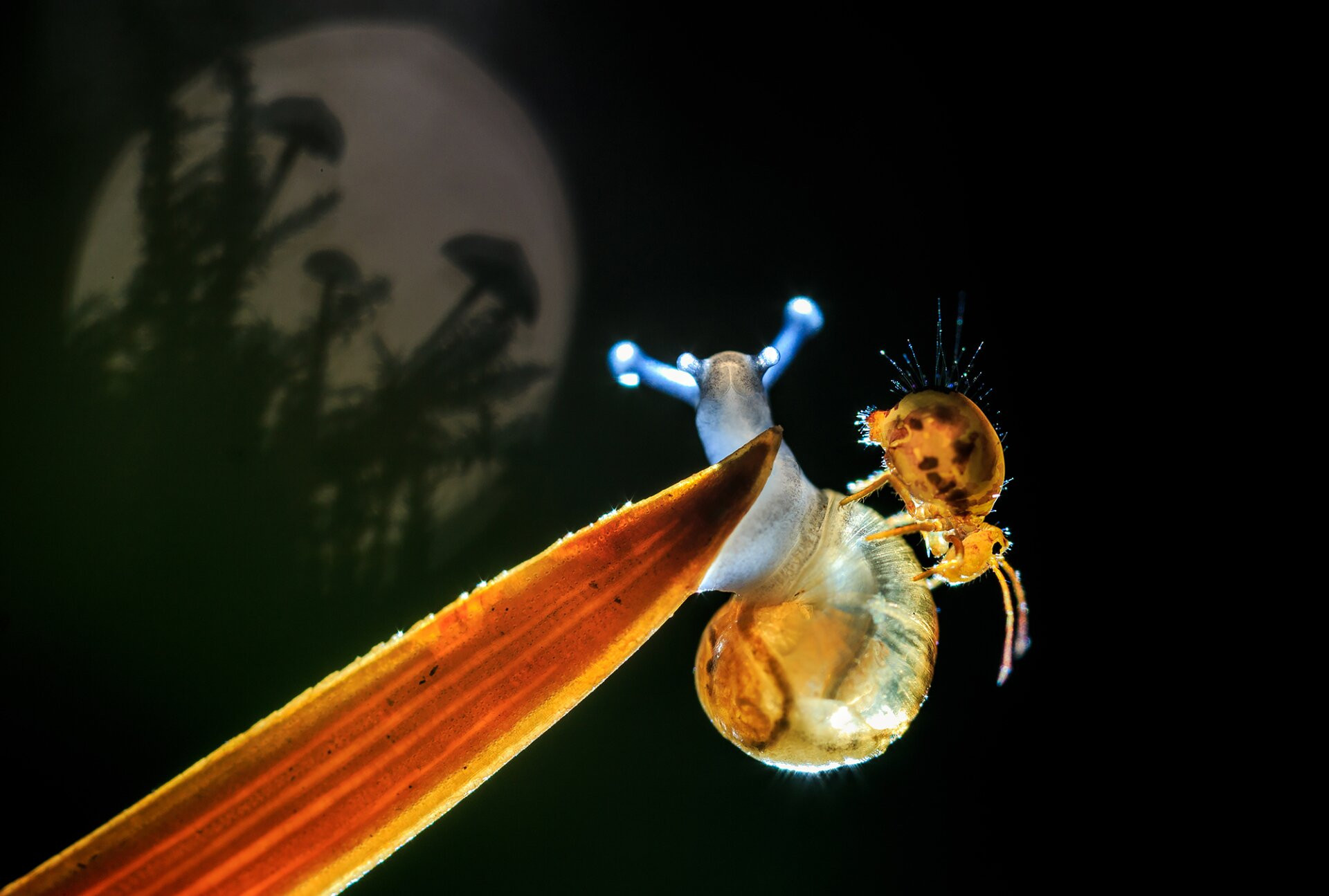 Egy parányi gömböcugróka lovagol egy fenyő tűlevelén egyensúlyozó, pár milliméteres csiga hátán