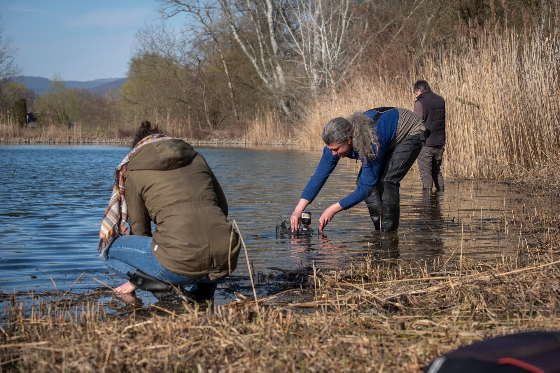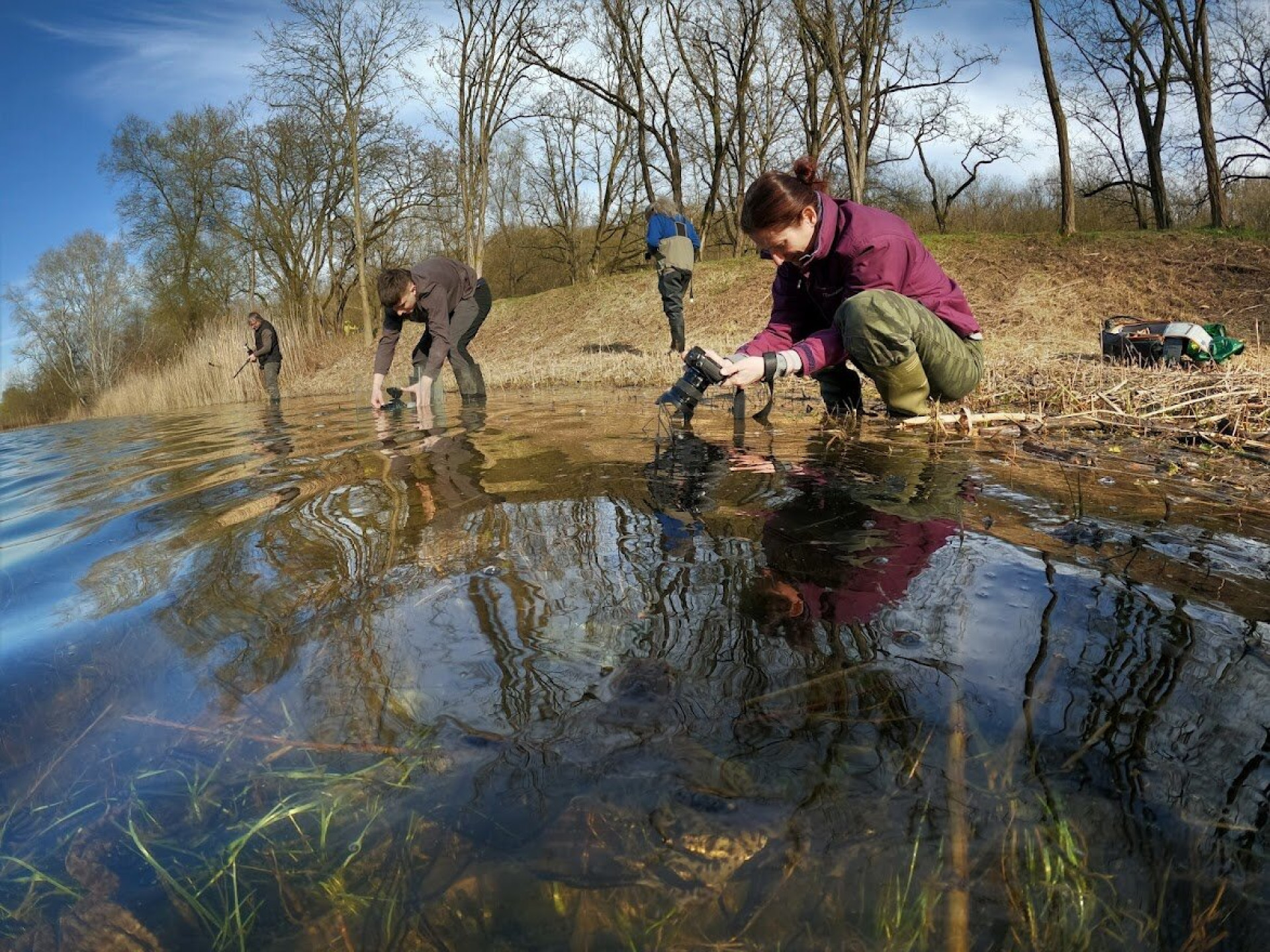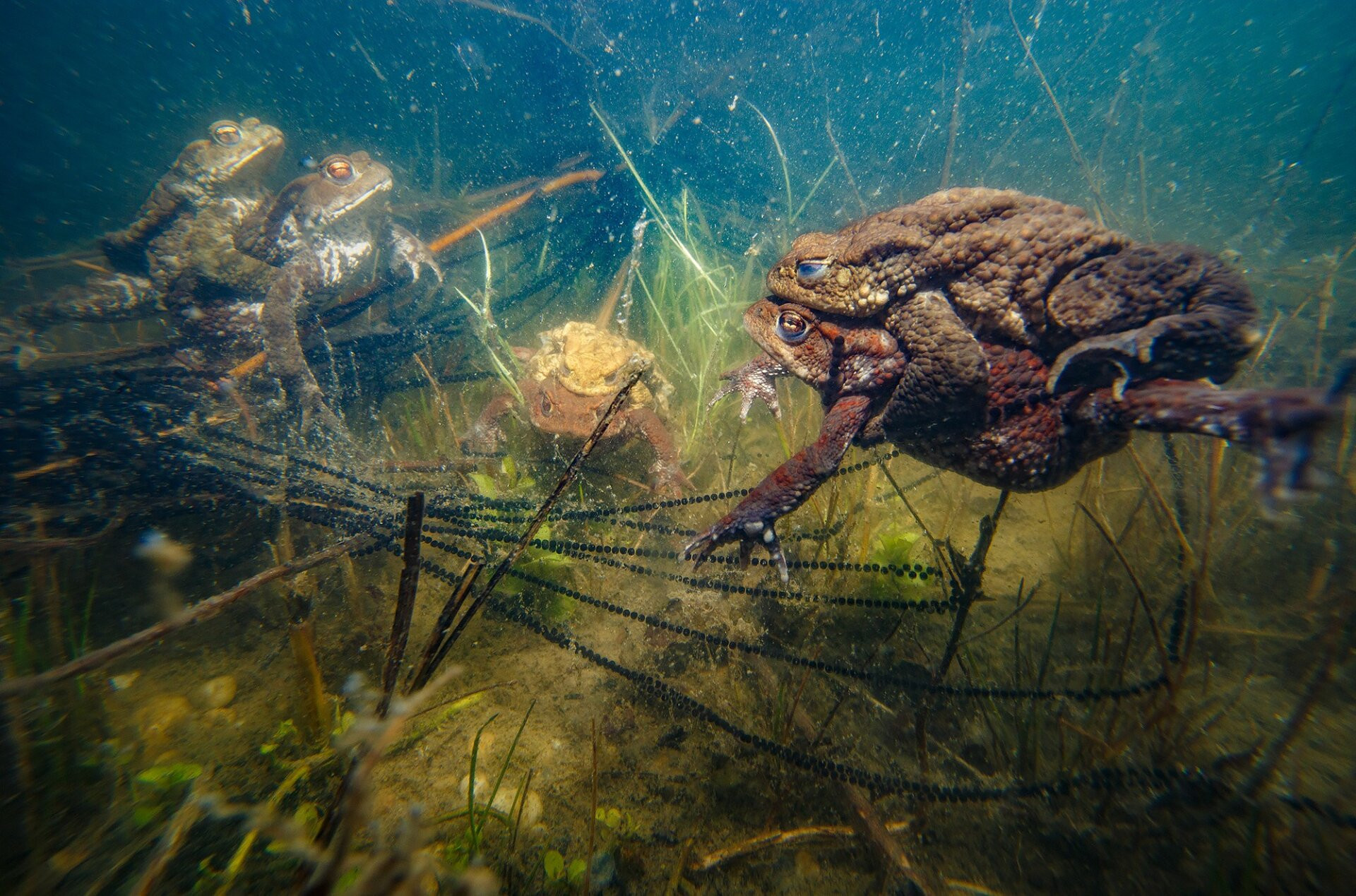 Előkerültek az akváriumok is, Zsolt a víz alól fotózta a petecsomók között nászoló békapárokat