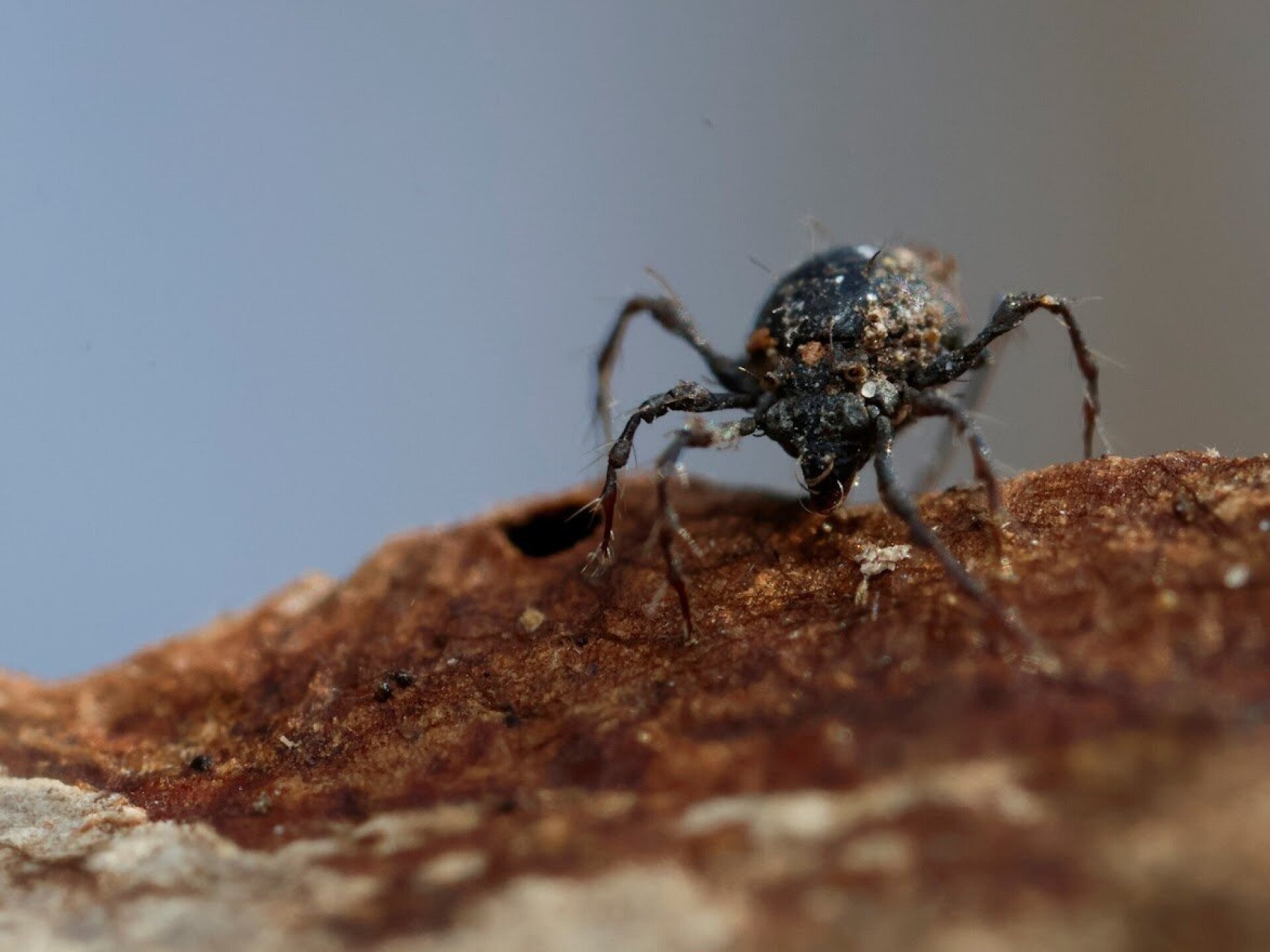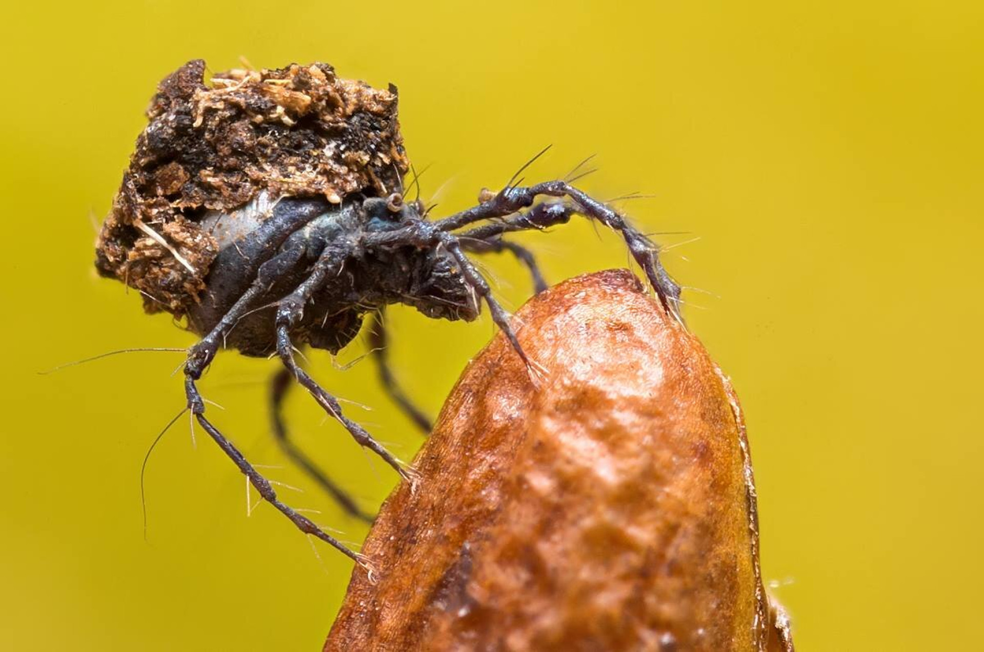 Zsolt egyik régi fotóján viszont tökéletes képet kaphatunk erről a cseles megoldásról. Érdekesség, hogy sok faj saját, vagy más atkák vedléseit is "beépíti" ebbe a kupacba, nem veti le teljesen kutikuláját, hanem a hátán viseli tovább egy részét